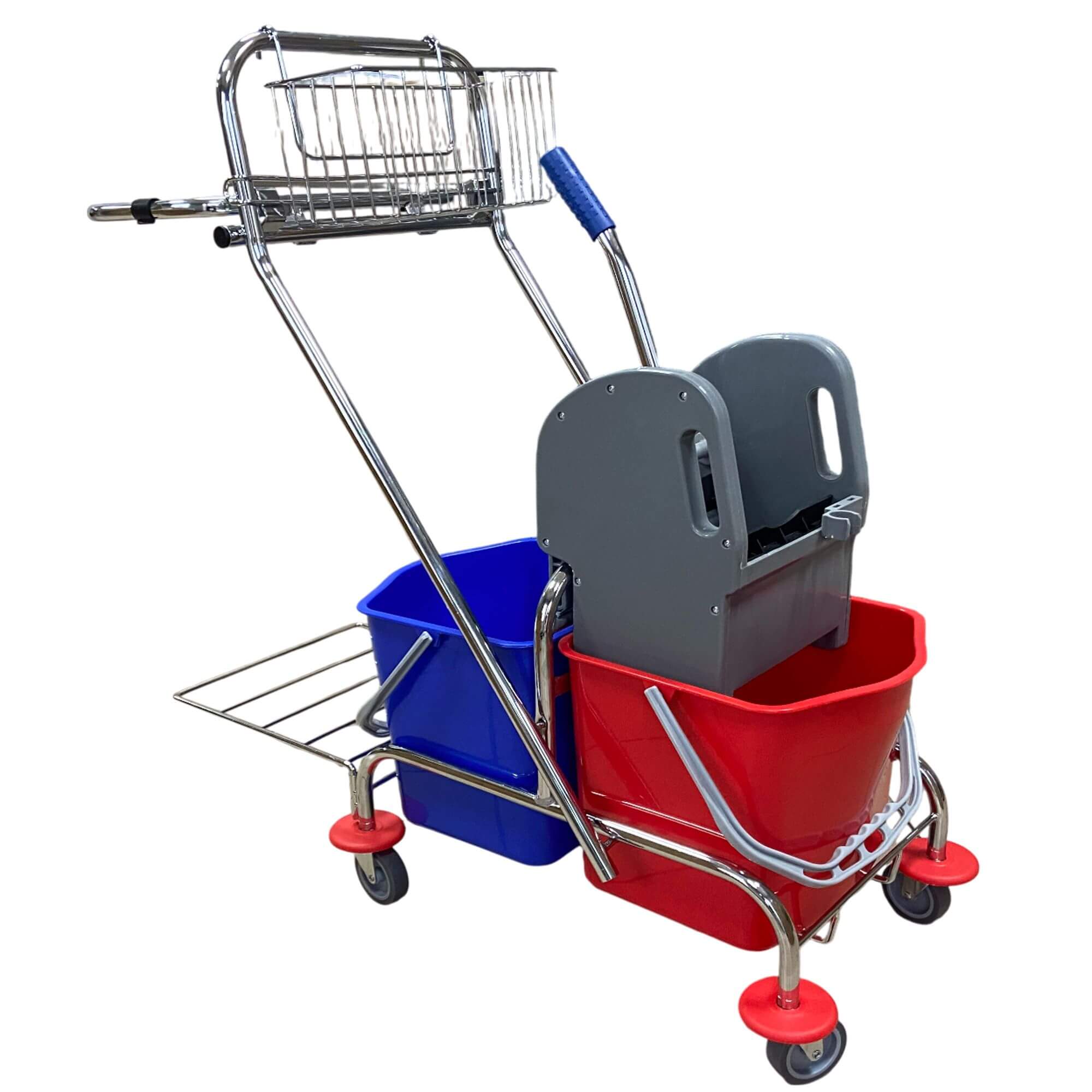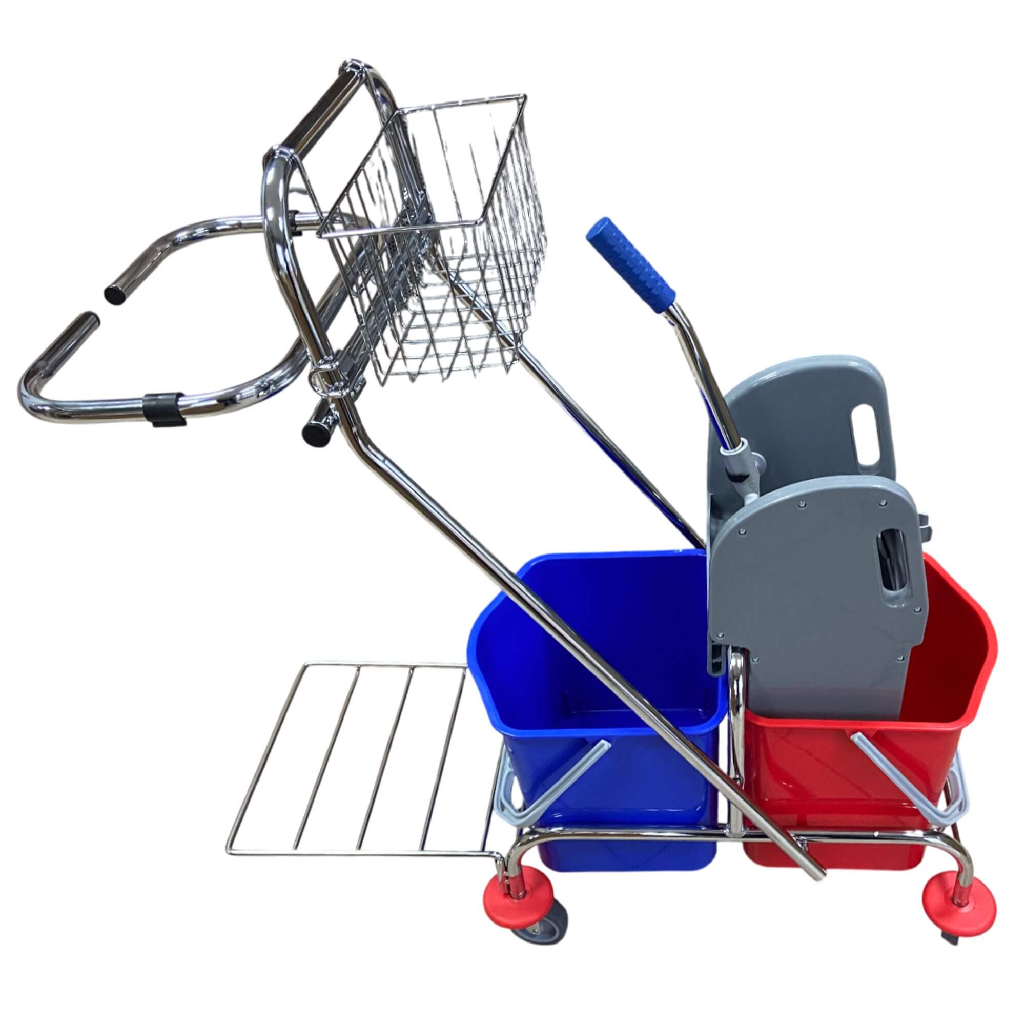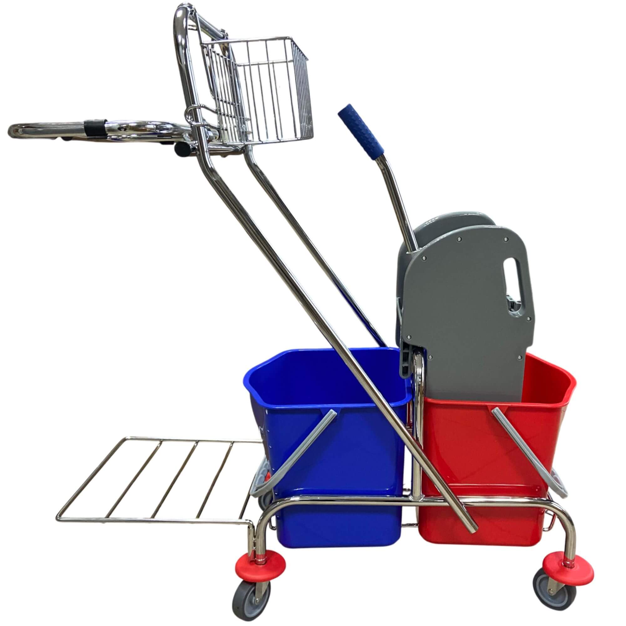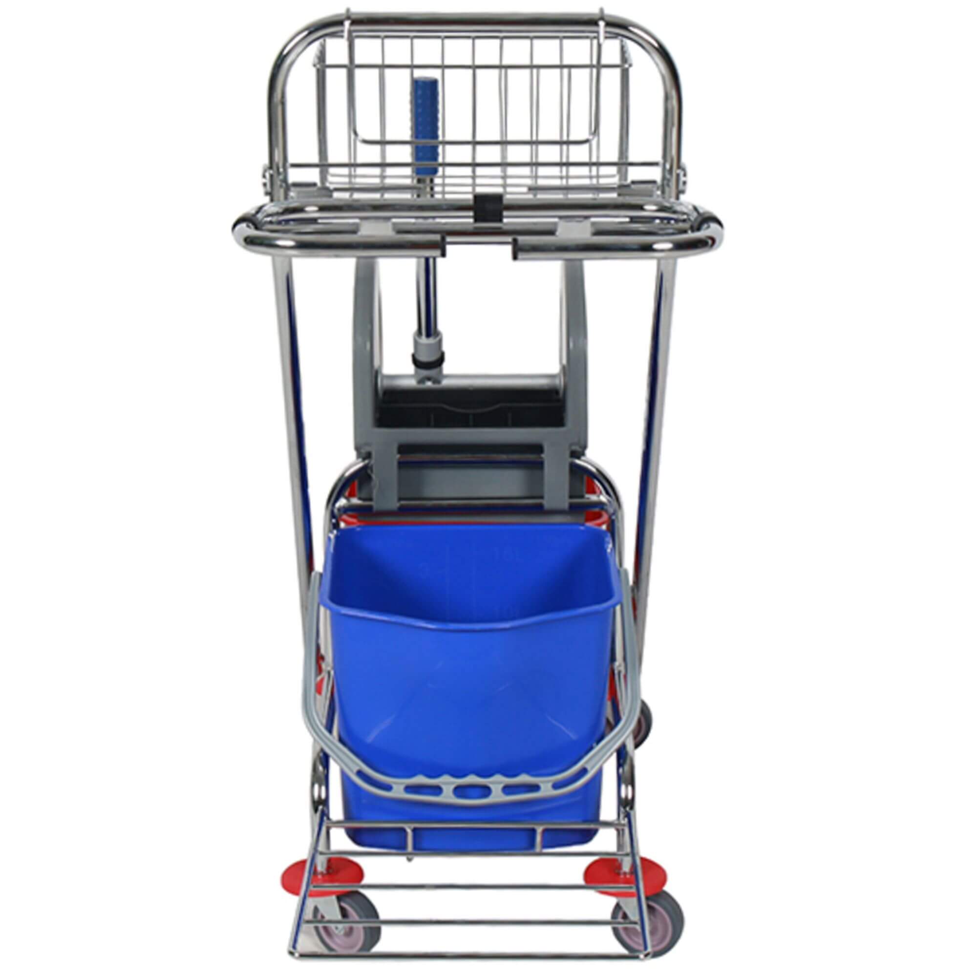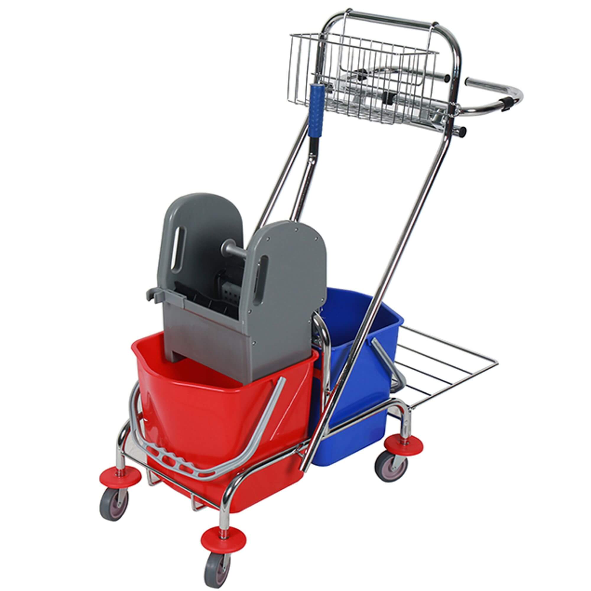 Nowoczesny dwuwiaderkowy wózek na podstawie z stali chromowanej do sprzątania jest bardzo popularny na wielu obiektach (średnich i dużych) usprawnia prace porządkowe, czyniąc je bardziej efektywnymi.  Wózek do sprzątania jest wyposażony w dwa wiadra o pojemności 17 litrów oraz prasę do wyciskania płaskich mopów. Dodatkowo posiada też koszyczek na akcesoria do sprzątania i środki chemiczne. Wózek został też wyposażony w uchwyt na worek na śmieci oraz podstawę, dzięki czemu kosze można opróżniać na bieżąco. Dzięki dodatkowemu wyposażeniu (koszyczek, uchwyt na worek) daje szerokie możliwości zastosowania.